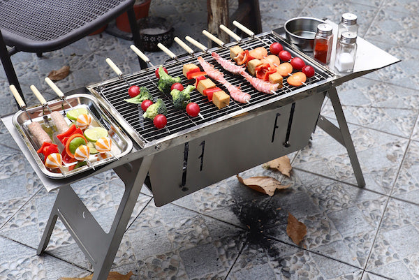 Foldable Barbecue Stand - Portable, Durable Stainless Steel Standing BBQ Grill, with Foldable Tray and Handle, Folds Small and Flat